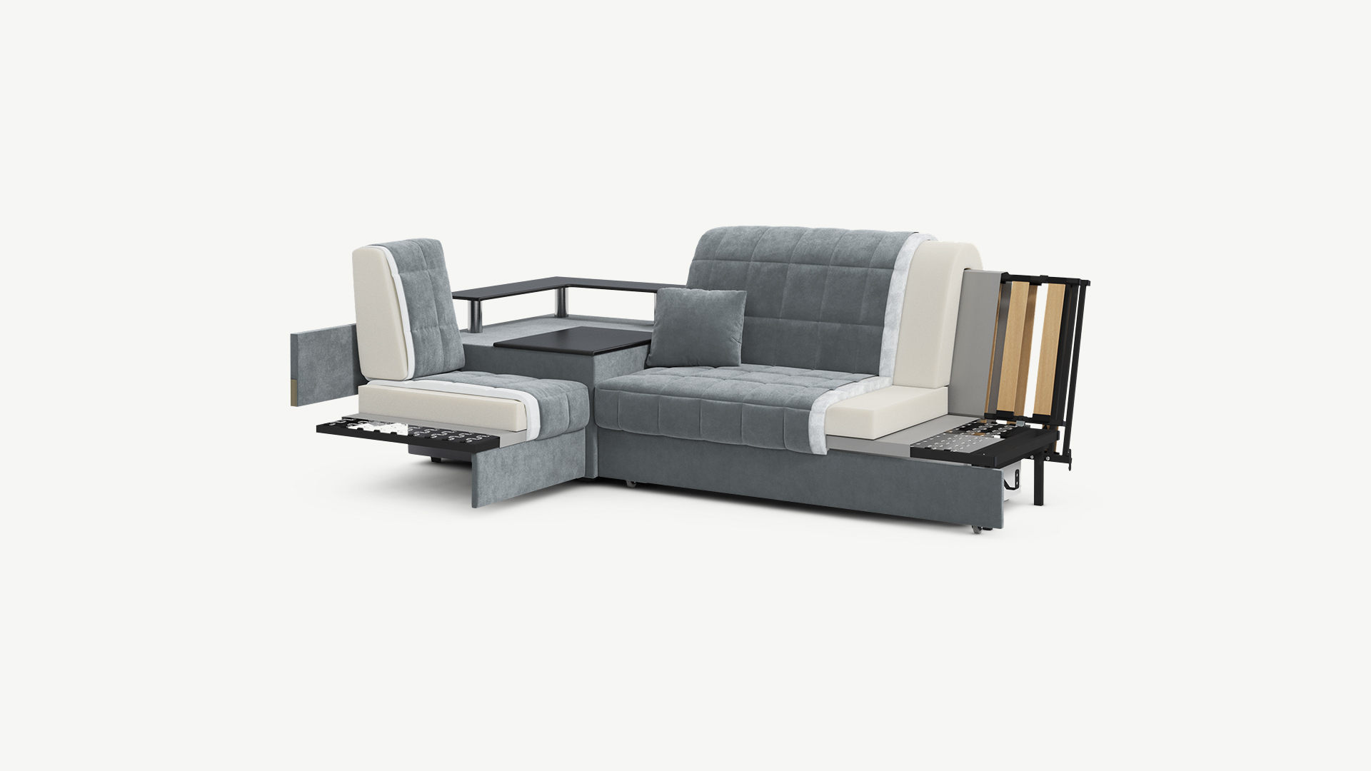 Выбирая угловой диван со столиком, Вы сможете проводить время с максимальным комфортом, многократно повысив функциональность дивана. Все дело в том, что под столешницей модуля расположена вместительная емкость для хранения. Кроме того, поверхность столика — идеальное пространство для чаепития в приятной компании, а также место для множества актуальных мелочей — от ноутбука до косметики.