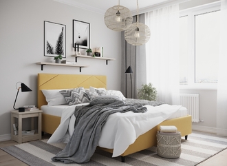 Элегантным и практичным акцентом служат скрытые карманы, расположенные по его углам. Лаконичные формы объемных царг создают единый гармоничный образ и фокусируют внимание на центральном текстурном элементе кровати.