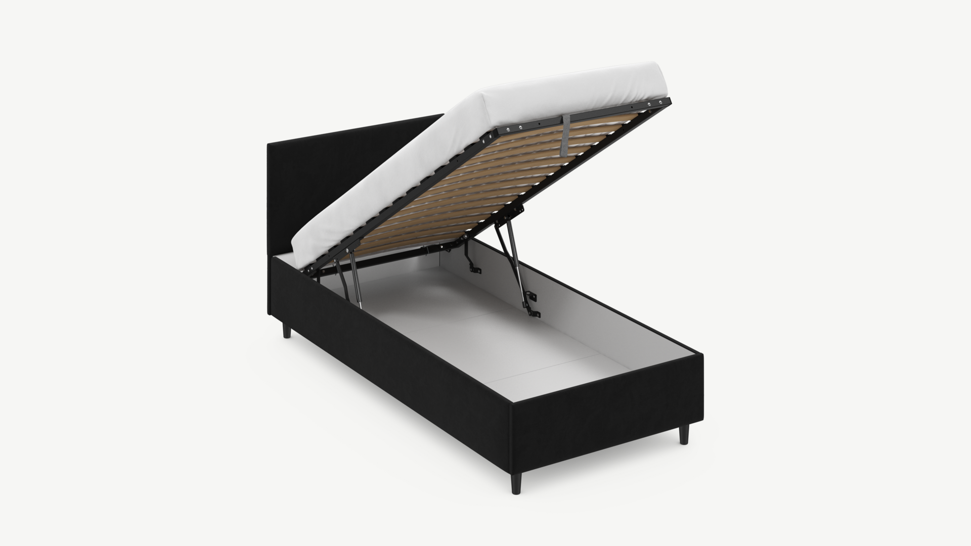 Вместительная емкость под кроватью без внутренних перегородок позволяет использовать для хранения вещей 100% пространства.