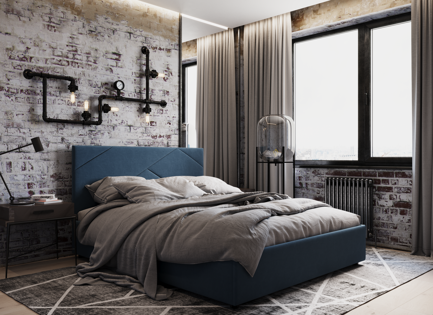 MOON FAMILY 1257 привлекает внимание оригинальным исполнением: широкие полосы ткани эффектно пересекают периметр изголовья, создавая на нем графический орнамент. Элегантным и практичным акцентом служат скрытые карманы, расположенные по его углам. Лаконичные формы объемных царг создают единый гармоничный образ и фокусируют внимание на центральном текстурном элементе кровати.