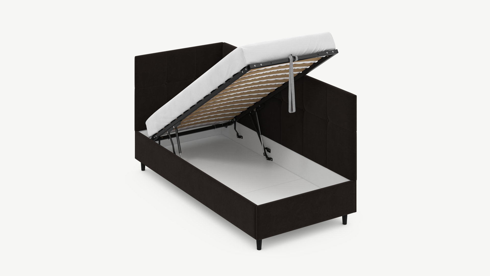 • Скрытая под основанием вместительная емкость без внутренних перегородок позволяет использовать всю площадь подкроватного пространства для хранения вещей.